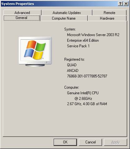 作業系統共安裝Windows Server 2003 x64以及Enterprise Linux 4.0,來進行軟體測試,測試機器共安裝4GB的記憶體,請參考下圖系統屬性。