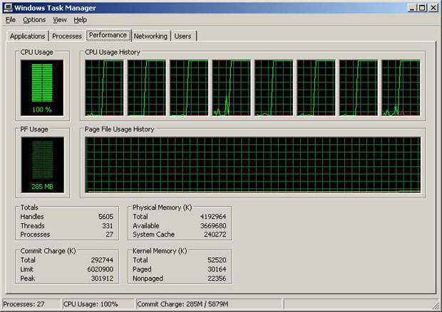 這次測試的機器特色在於安裝了,Intel最新款的四核心處理器,也就是在一個處理器裡封裝了四個核心(Core),每個核心各自有L1快取記憶體,以及 SSE延伸指令集,每兩個核心共享一組4MB的L2快取記憶體,在執行單一程式時可以使用到4MB的L2快取記憶體,若是同時8個核心執行運算,每個核心 可以分配到2MB的L2快取記憶體,由於處理器存取記憶體的延遲時間,L2快取記憶體的速度比主記憶體快了十幾倍以上,所以L2快取記憶體的空間越大,可 以大幅提升計算效能。