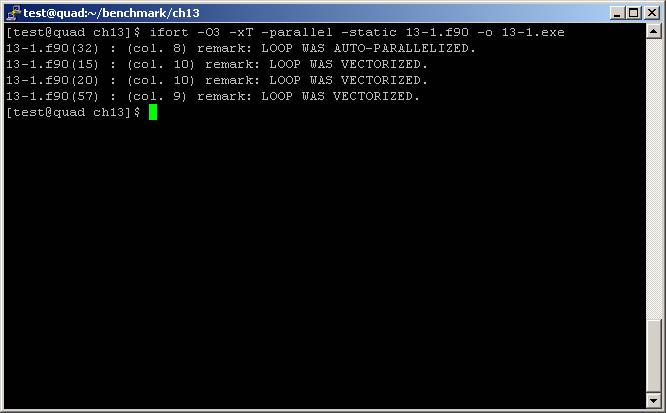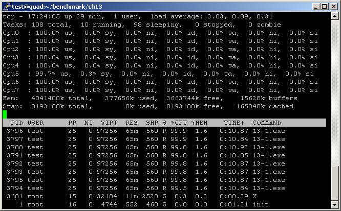 執行過程畫面如下,同樣可以透過top指令看到八個核心同時計算的結果,因為這個範例使用static link所以會出現八個執行程序,而這八個程序實際上是分享同樣的記憶體區段,透過平行計算加快運算速度。