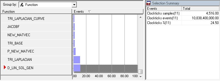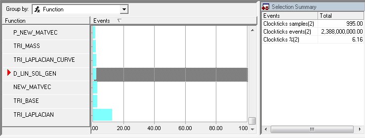 首先從VTune的Sample結果來看, 在CVF這組的最花時間的是TRI_LAPLACIAN副程式, 而D_LIN_SOL_GEN只佔6%的計算時間