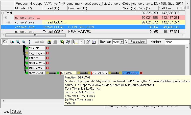 接著為了能夠明確的找出程式執行的瓶頸, 採用Intel VTune軟體來進行效能的測試, CVF和IVF都使用Debug模式來編譯程式, 產生兩組執行檔後, 使用VTune來執行程式, 經過測試後發現一個有趣的現象